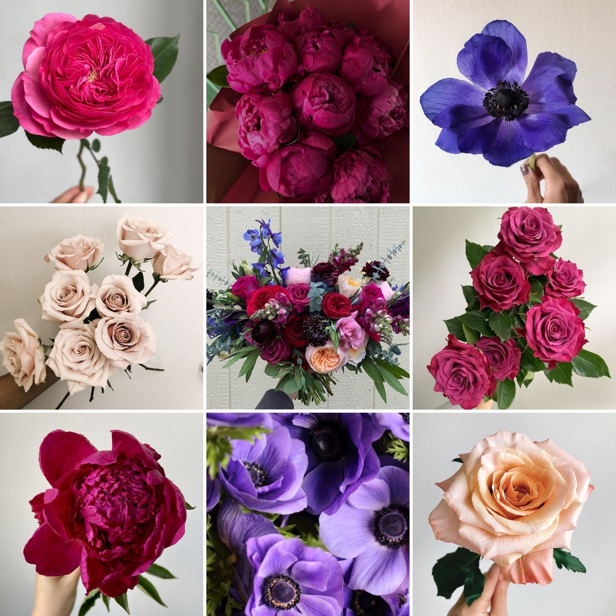 Created in honour of Ainsley turning another year older, this bouquet reflects the colours and textures she loves most. Blue purple anemones, deep pink peonies, fuchsia and quicksand roses layered with rich burgundy accents. Bold. Romantic. Unmistakably Harp and Fin.