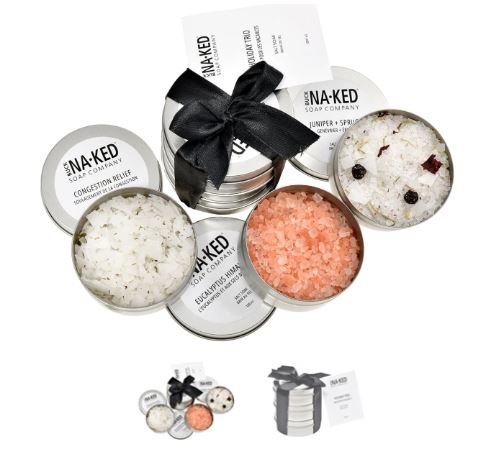 HOLIDAY TRIO: Whether given as a gift or kept for yourself, the Buck Naked Mini Holiday Salt Soak Trio shares the best in winter salt soak scents including, our energizing Eucalyptus Himalayan Salt Soak, rich Juniper + Spruce Salt Soak and soothing Congestion Relief Magnesium Salt Soak. Pick up the perfect holiday gift, all wrapped in a bow!