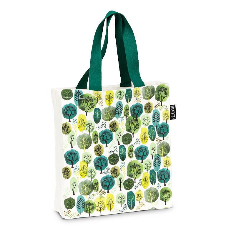 Large cotton tote with sturdy green handles is accented with bold, graphic trees allover — perfect for carrying everything from groceries to books and more.