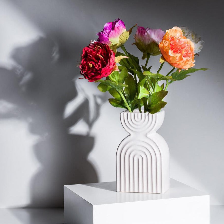 This unique geometric design of this Wide Double Arch Vase makes a stylish addition to any type of decor. Crafted out of stoneware, this ivory-coloured vase features a subtle yet eye-catching pattern to accent its elegantly symmetrical art deco design, and your favourite flowers or blooms.
