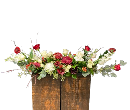 A heartfelt expression of love and remembrance, this casket spray offers a serene and elegant tribute. Deep red roses and chrysanthemums stand out against a backdrop of pure white roses and snapdragons, accented with touches of greenery and delicate branches. This arrangement creates a beautiful and comforting display, honoring a life cherished and deeply missed.