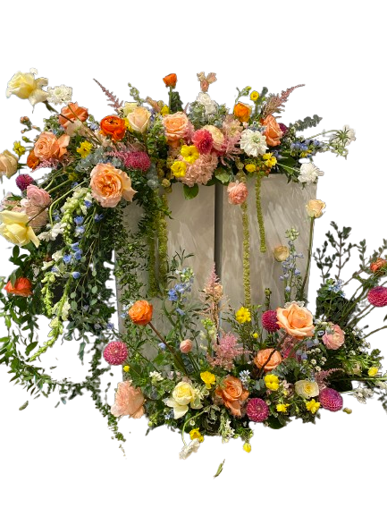 This vibrant and textured floral display offers a unique and heartfelt tribute. A rich mix of peach and coral roses, yellow ranunculus, and pops of pink dianthus are artfully arranged with trailing greenery, creating a cascade of color and life. This arrangement provides a comforting and beautiful presence, suitable for a memorial service or celebration of life.